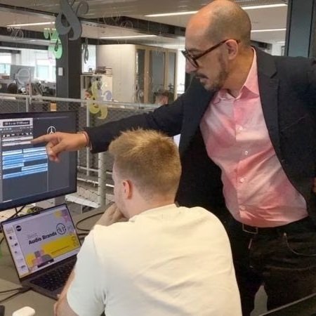 Michele Arnese of Amp looks at AI-generated music with a colleague
