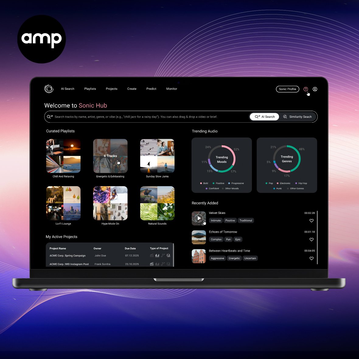 Additionally, in a major advancement that amplifies Sonic Hub’s creative power, amp Sound Branding has partnered with SourceAudio, the music industry’s most widely adopted sync platform. This integration brings SourceAudio’s expansive music library of over 33 million songs from production music companies, independent artists, and publishing companies directly into Sonic Hub. Users can now access and filter these tracks through AI-powered search tailored by brief, brand profile, audience, video content, and specific media moments.