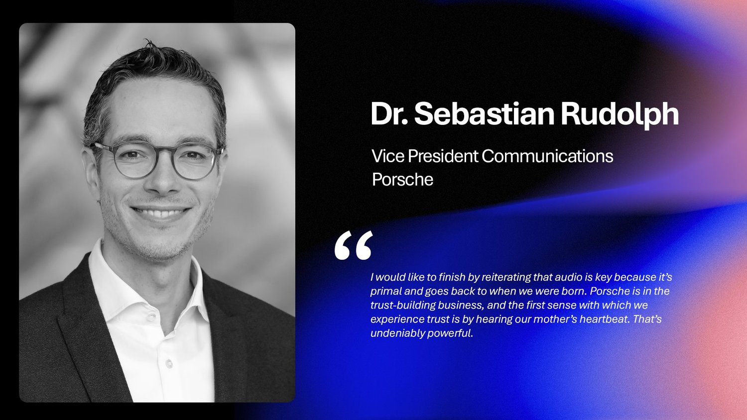 “I would like to finish by reiterating that audio is key because it’s primal and goes back to when we were born. Porsche is in the trust-building business, and the first sense with which we experience trust is by hearing our mother’s heartbeat. That’s undeniably powerful.”